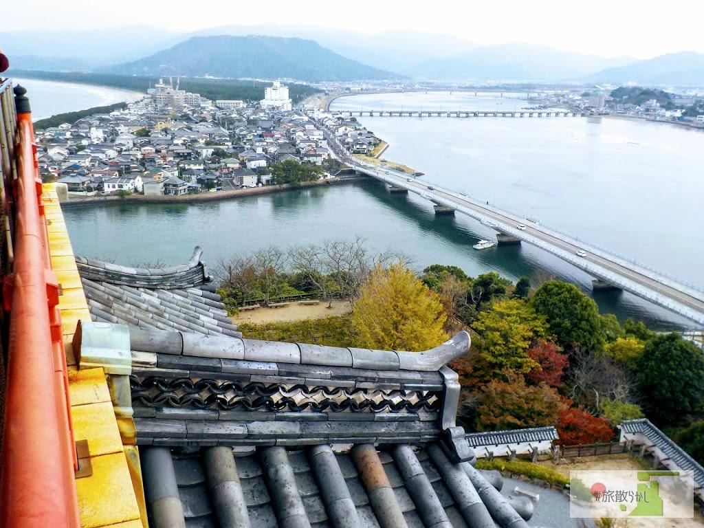 庭園の中ばかりに目が行ってしまいますが、少し開けた場所からは、周囲の景色が望めます。青々とした庭園内の松や草木の向こう側に見える町景色は素敵です。