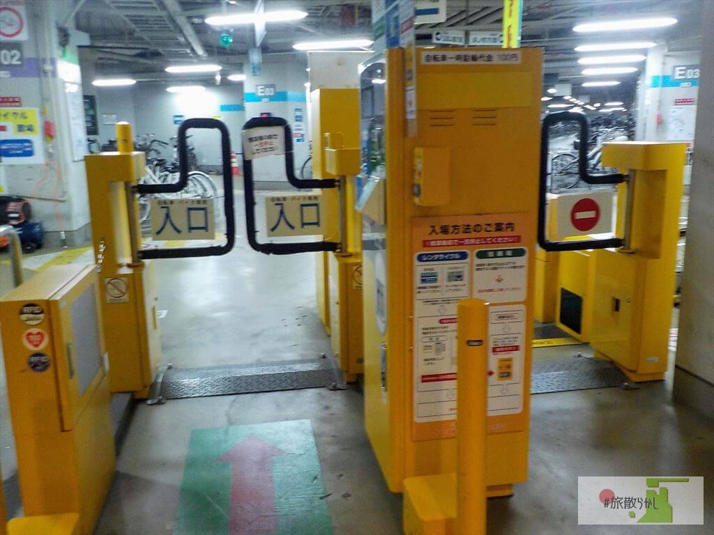 黄色のゲートから返却を行います。精算機が横についているので、①利用証カードを通す、②利用料金を支払う、③終了ボタンを押す、の手順で簡単に返却を完了させることができます。