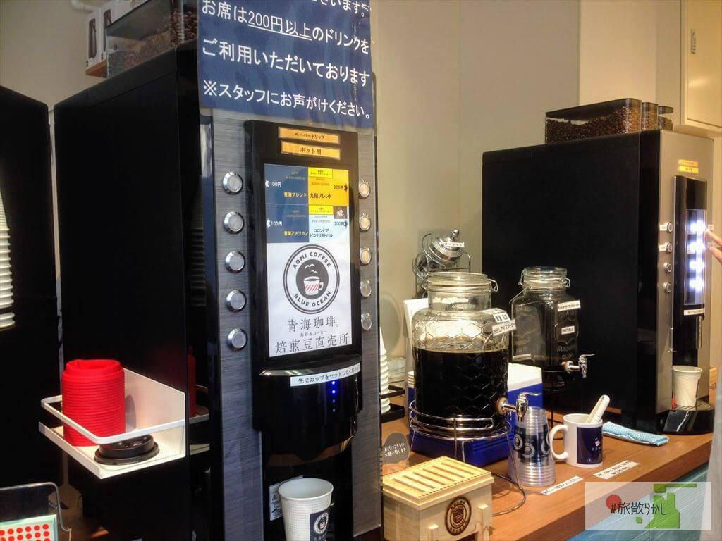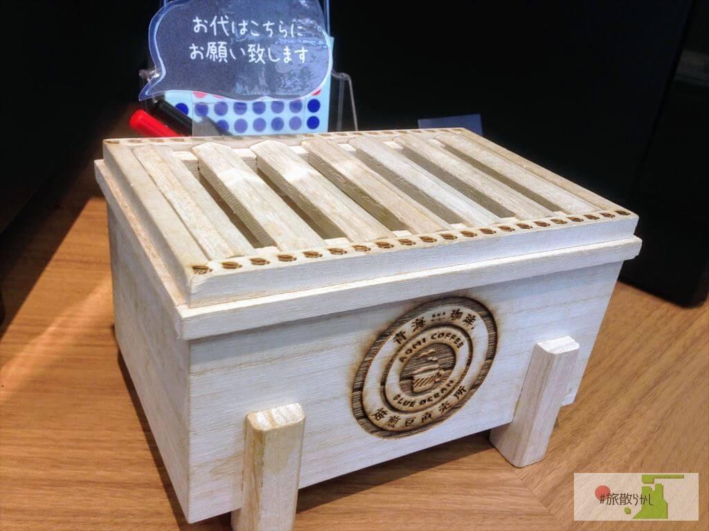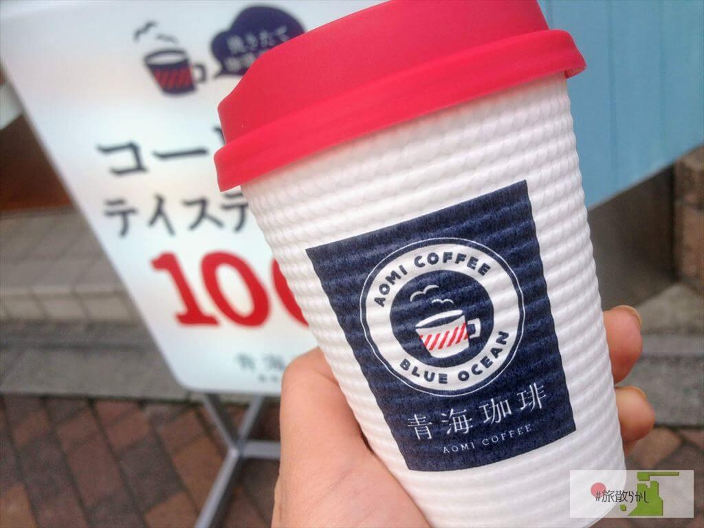 テイクアウトはセルフサービスになっています。店内に設置された賽銭箱に100円を入れまして、淹れたのは「青海ブレンド」。コーヒー苦手な方は、カフェラテもあります。