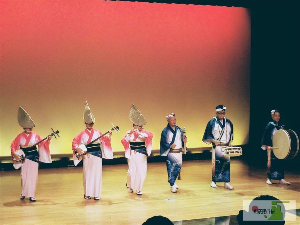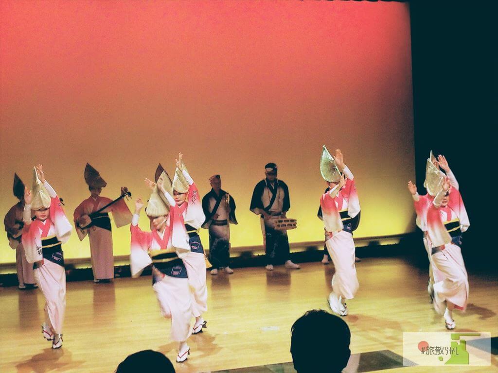 さて、阿波踊り会館の最も大きな見どころは、阿波踊りの公演が鑑賞できる所。実際に演者のみなさん(しかもおそらくベテラン)が毎日実演をしている。昼公演は1日4回(11:00、14:00、15:00、16:00)、夜公演は1日1回(20:00)。