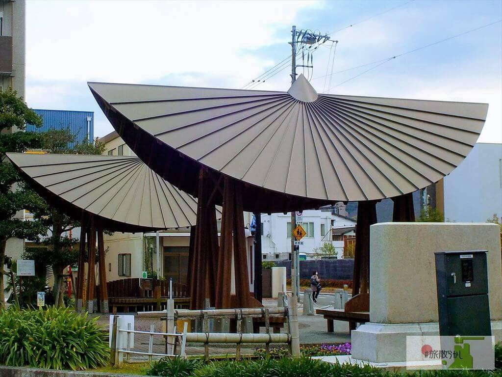 - 会館前には阿波踊りの笠モチーフのベンチがあった。