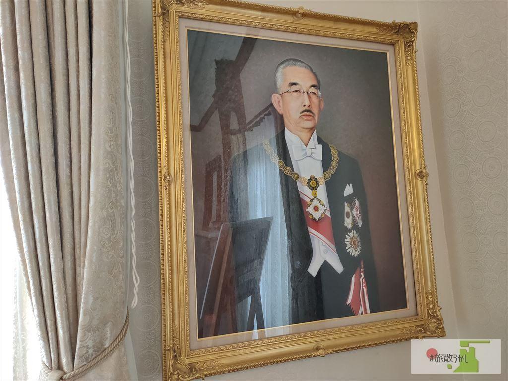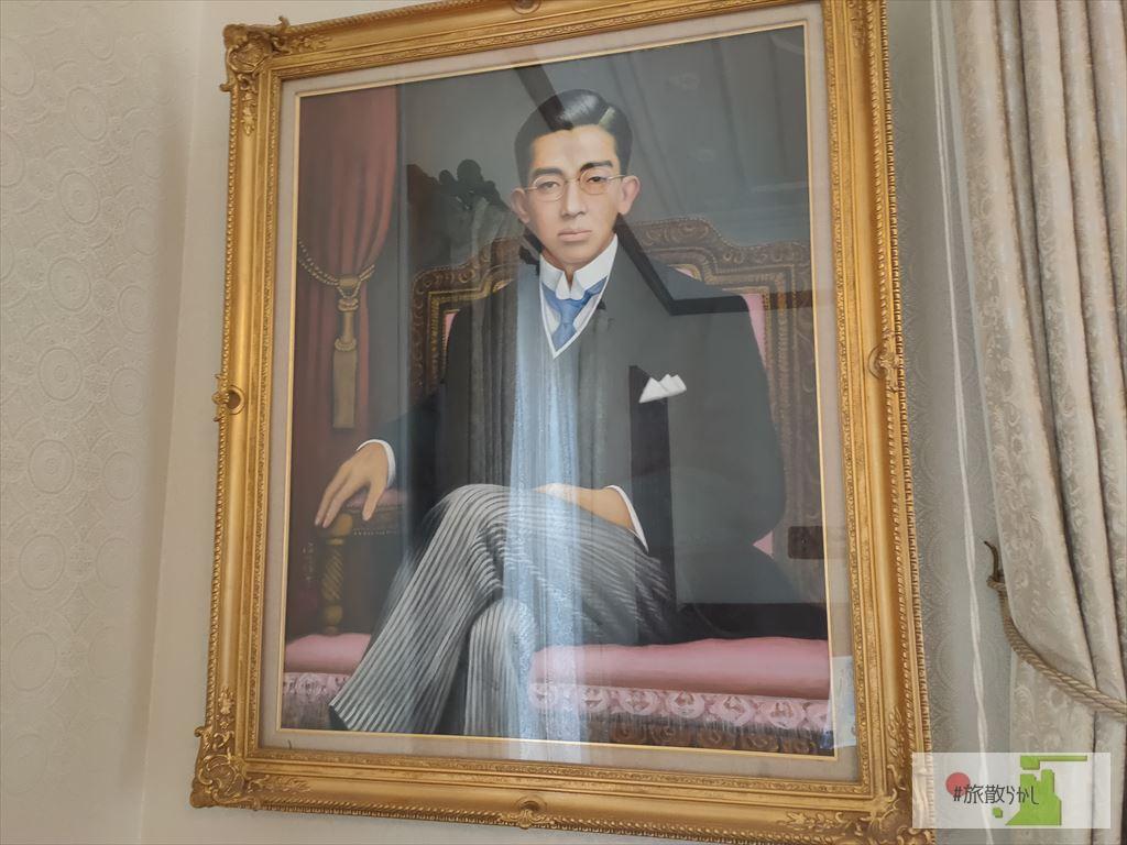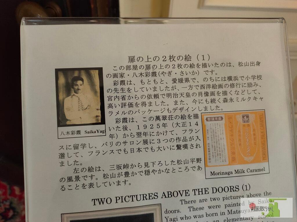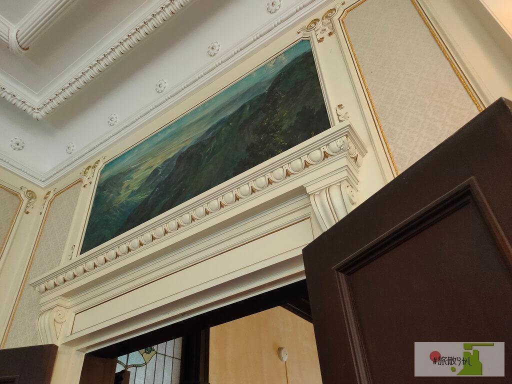 1階の扉上部には2枚の絵が展示されています。これは松山出身の八木彩霞(画家)によって描かれたもの。明治天皇の肖像画を描くなど、社会的に高い評価を得ていた人物です。