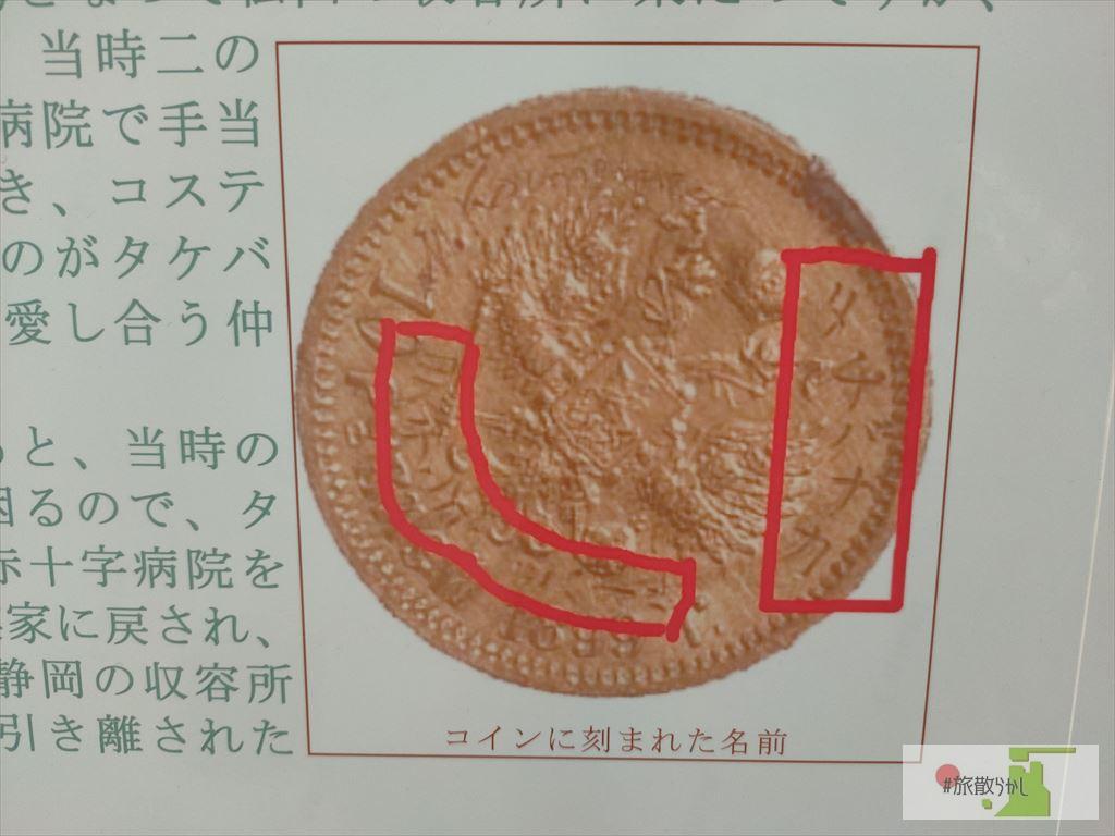 - 「タケバ ナカ」「コステンコ ミハイル」と刻まれているコイン。