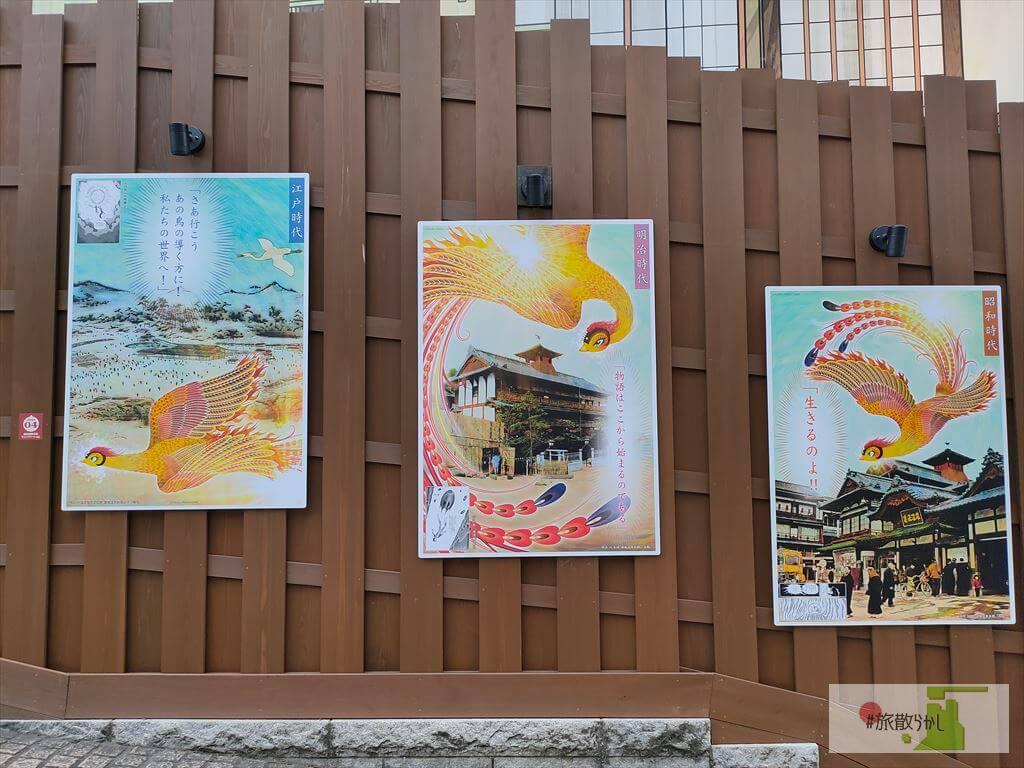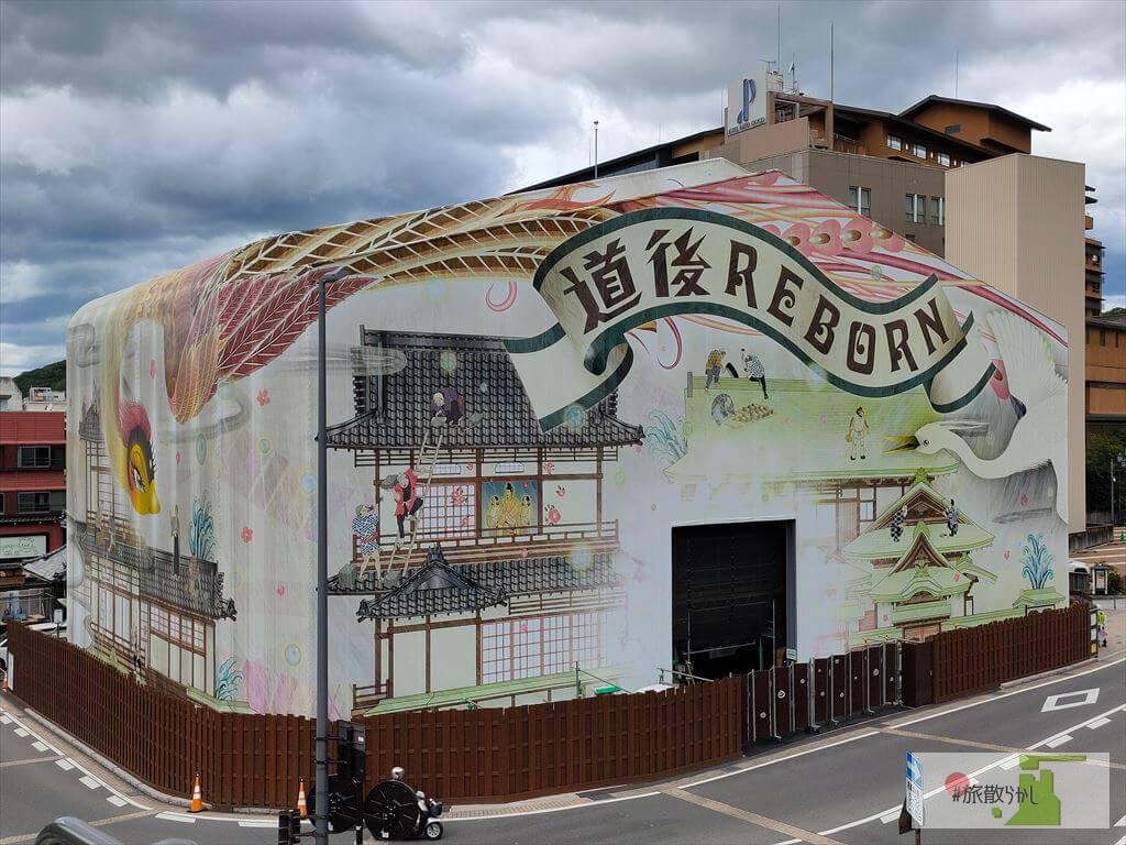 令和6年完了予定で進められている「道後REBORNプロジェクト」では、手塚治虫「火の鳥」とコラボした装飾がなされており、工事の様子を全て覆い隠すラッピングアートやプロジェクションマッピング等のコンテンツで観光客を楽しませてくれます。