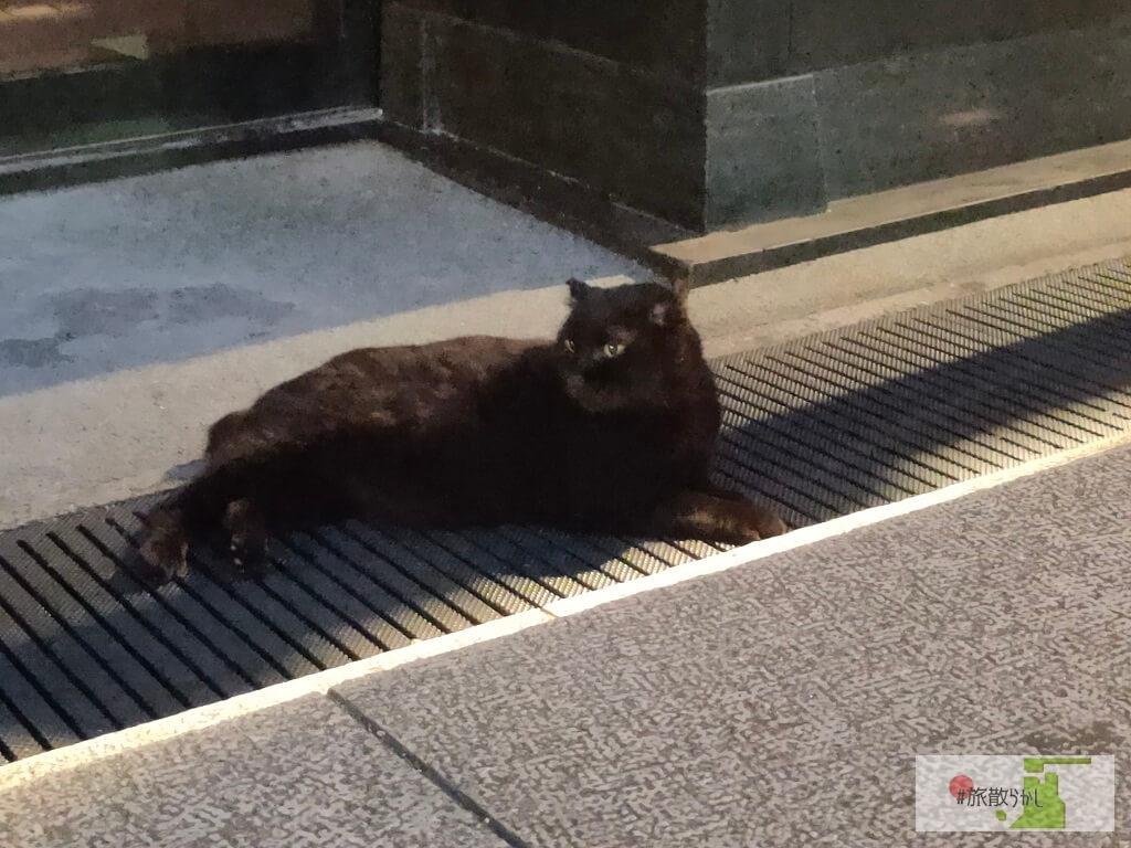 - 夜のライトアップに照らされる黒猫(左手前)。