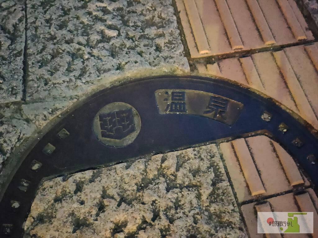 - 「温泉」のマンホール。この下を源泉が通っている。
