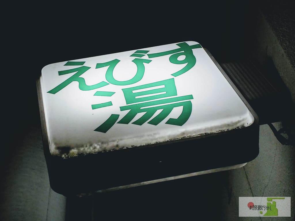 若干、洋風建築の雰囲気が漂っていて、某東京大学のあの辺りにある建築物を思い浮かべてしまった。そして、個人的に一番射抜かれたのは外の看板。くすんだ白に照らされるノッペリとした緑色のフォントでえびす湯と書かれています。たまらん。