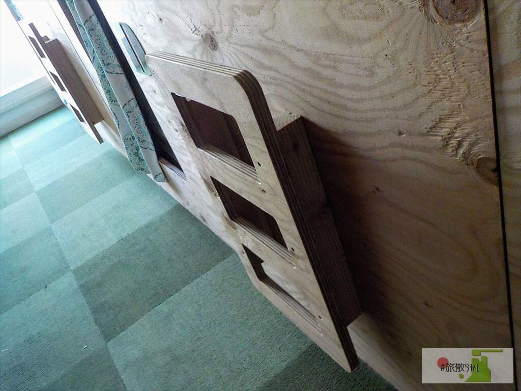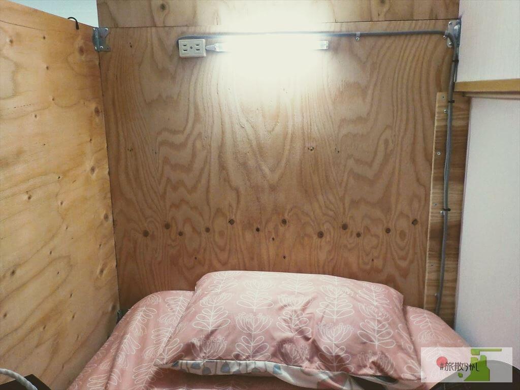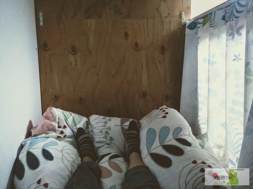 - (左)布団が可愛かった。ドミトリーはそれほど広くはないが高さはある方。