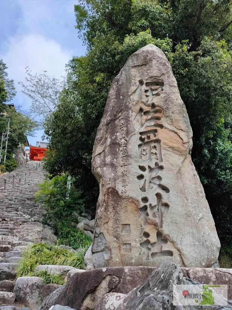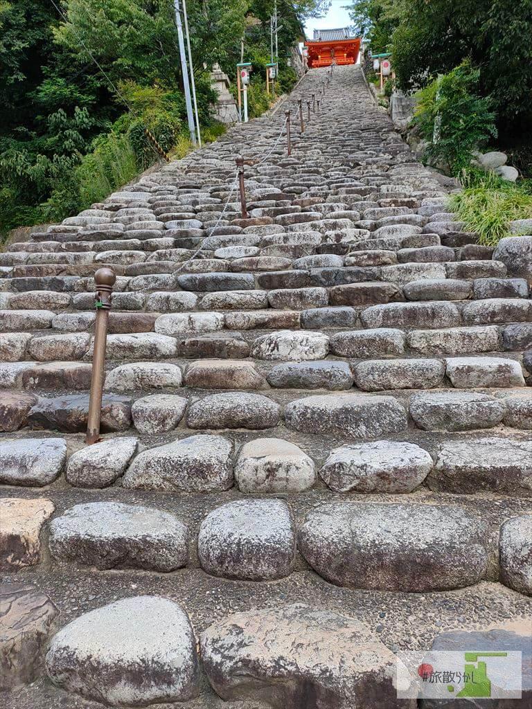 伊佐爾波神社に向かって歩いていると前方に目立つ朱色の楼門が見えてきます。それと同時に目に入るのが、圧強めの石段。何だか和歌山にもこういうところあったなと思いつつ、意を決して登ります。足場は整っている方ですが、それなりに不安定な部分もあったのでヒールだと危ないかもしれません。