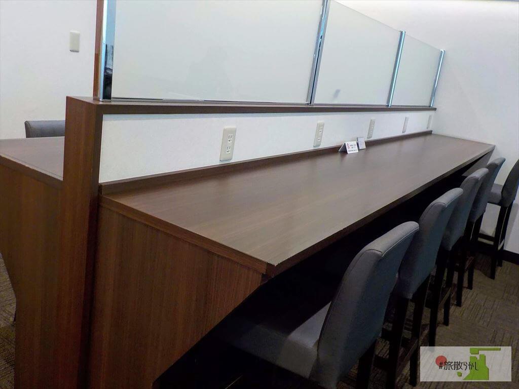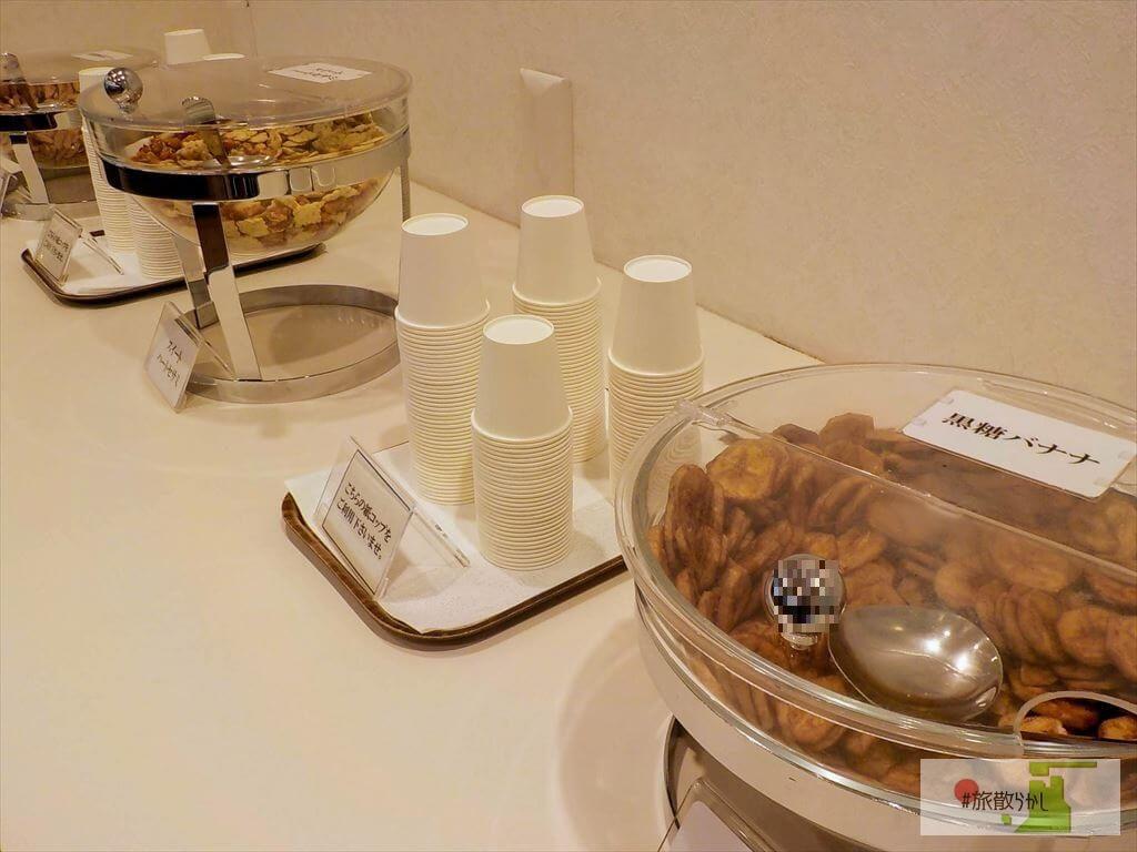 ドリンクサーバーやお菓子のバイキングがある。どれも自由に食べて良い。コンセント付の席で、つまみながら飲みながら仕事ができてはかどった。