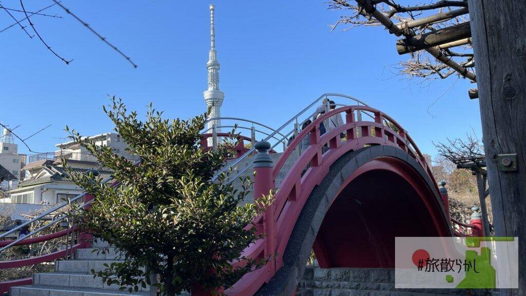 境内にある朱色が美しい太鼓橋は見どころです。スカイツリーと合わせて景色を写真に収める方も多いです。その他、季節に合わせて梅まつり(2月上旬〜3月上旬)や藤まつり(4月中旬~4月下旬)、菊まつり(10月下旬〜11月中旬)が開催され、多くの参拝客で賑わいます。