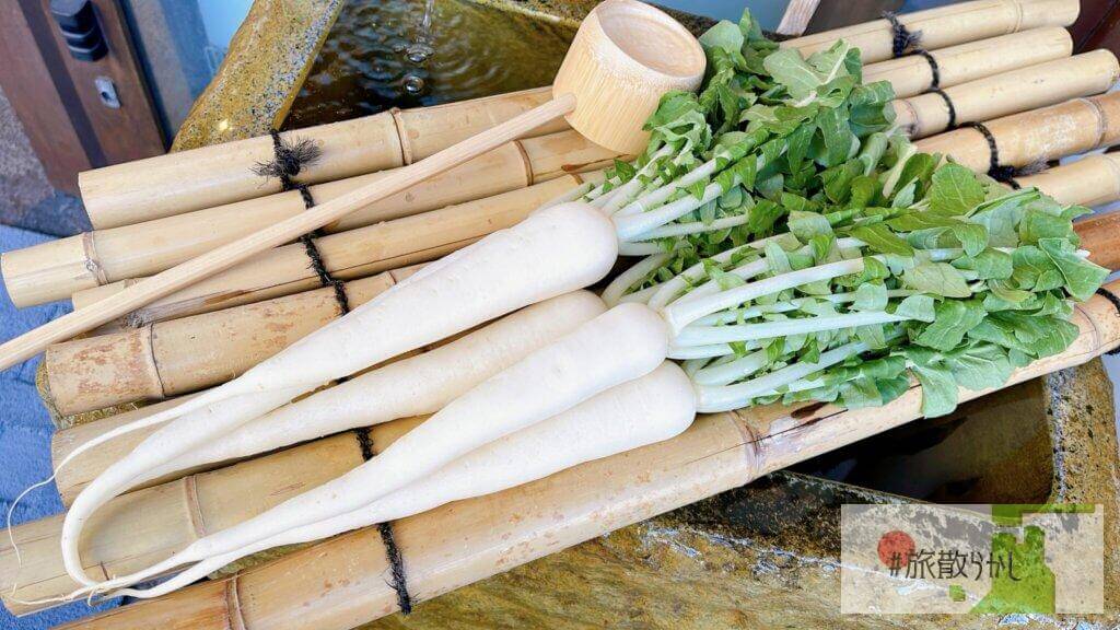 境内には、恵比寿神と大国神の像があり、一年の無事を祈願するお水掛けがあります。自分の痛いところを洗って清めます。