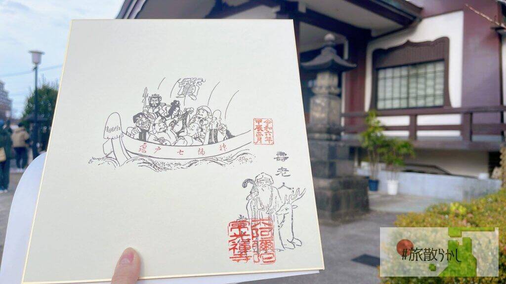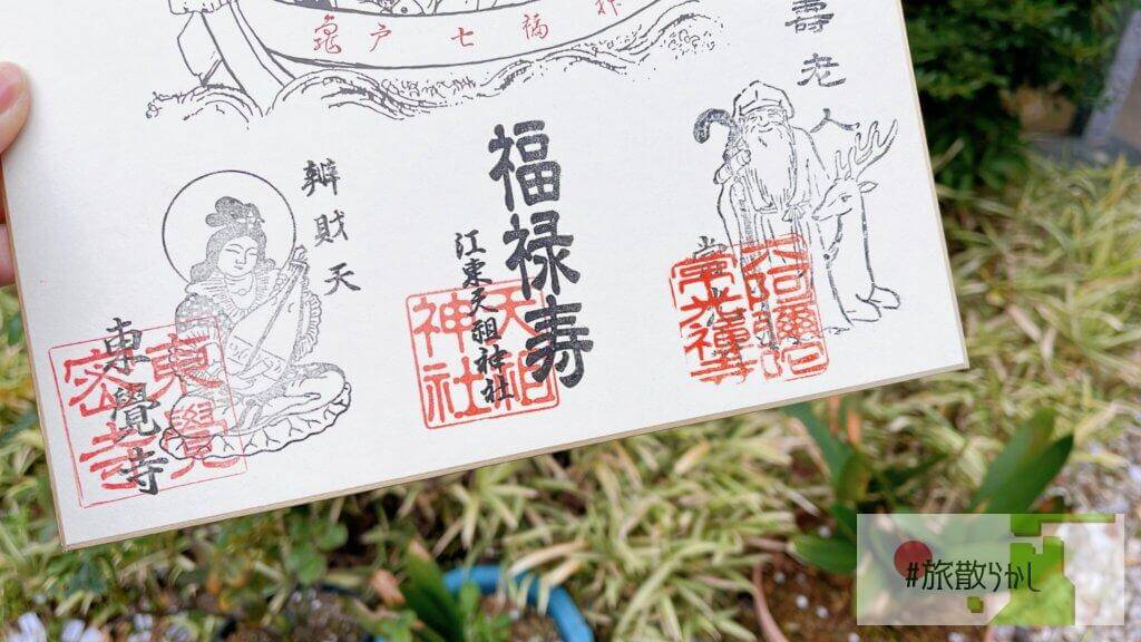 | 授与品 | ・七福神色紙500円+各寺社で押印代200円 ・御朱印帳への記帳 300~500円 ・絵合わせ台紙パズルは平成30年に廃止 ・亀甲七福神手ぬぐい1000円 |
