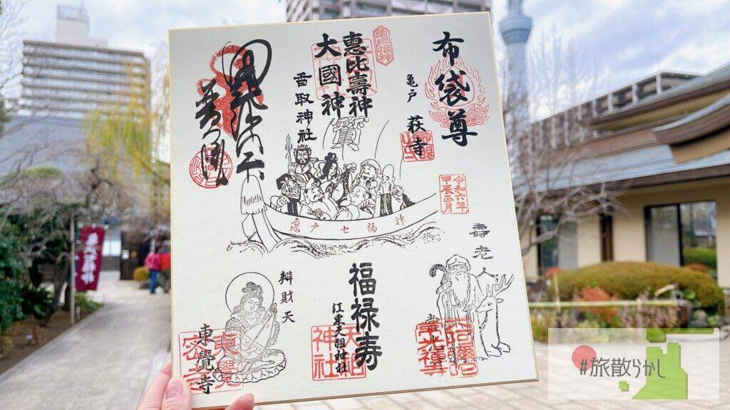 亀戸七福神巡りでは、七福神専用の色紙があります。一番最初に参拝した寺社で色紙を購入し、各寺社で朱印スタンプを押して回ります。各寺社でのスタンプ代は200円です。