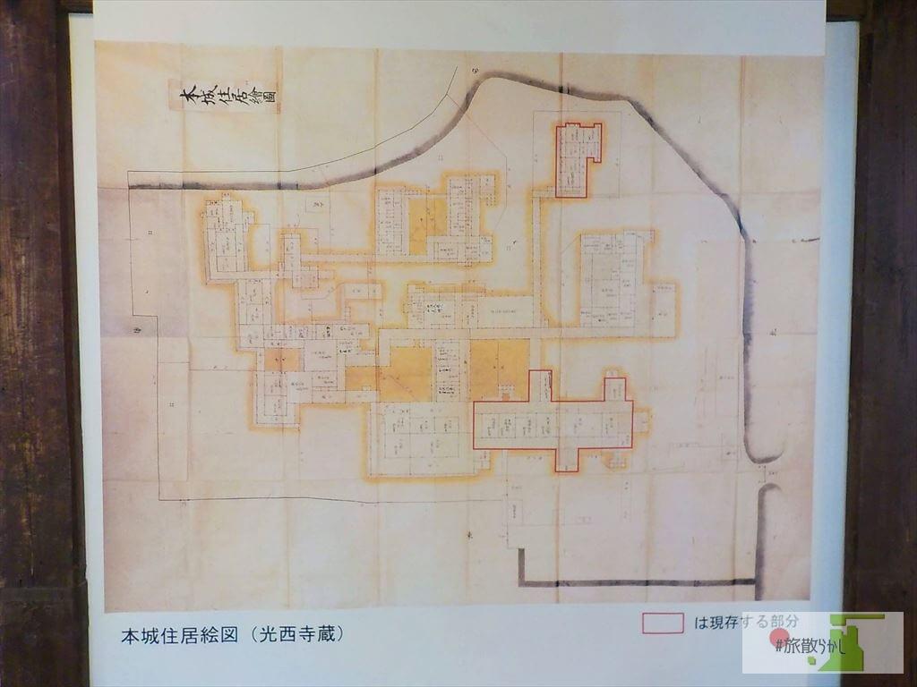 当時の城内の様子が描かれた図面が展示されています。光西寺に残されていたもので、これを見ると家老詰所の場所が本丸の奥の方に囲われていたことがわかります。家老の常駐先です。