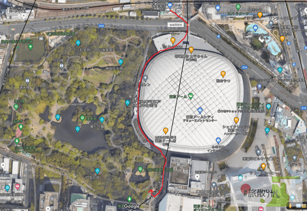 小石川後楽園の入り口は「西門」「東門」の2箇所あります。東京メトロ丸の内線「後楽園駅」から来る場合は、東京ドームに沿って歩いていき、黄色い建物の前にある「東門」から入るのが近いです。
