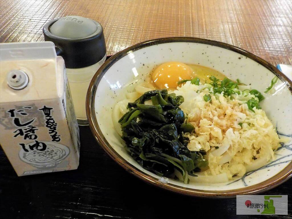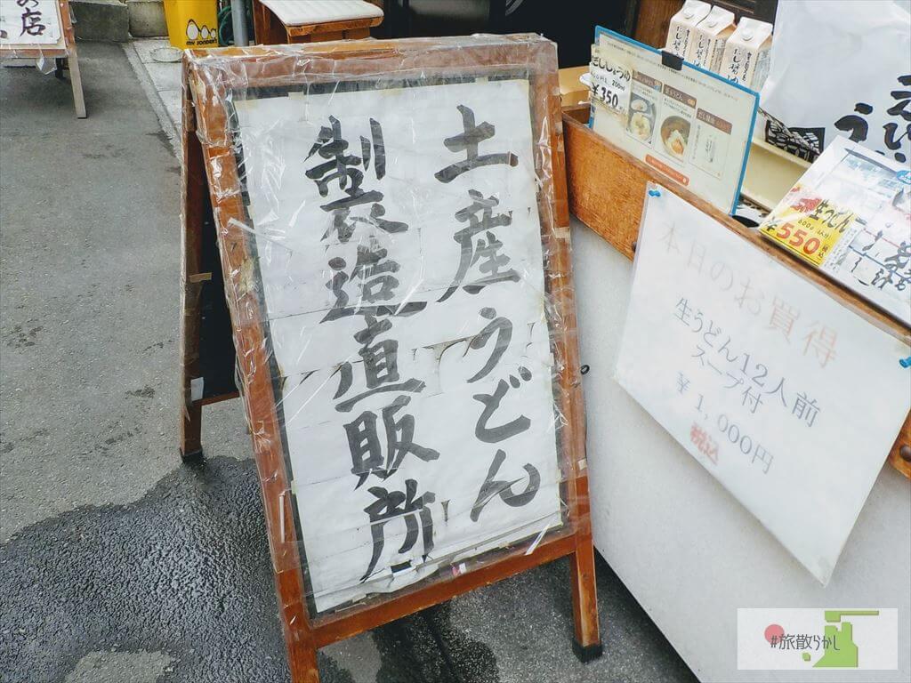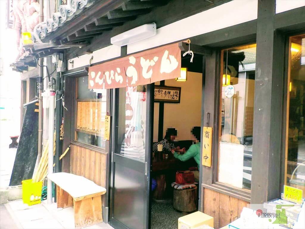 そんな参道をウロついていると、道路の向こうから「いかがですか~うどん美味しいですよ~」。声のする方を見ると、讃岐うどん屋さんを発見。これから金刀比羅宮の長い階段を登り続けることを考えると、ここで炭水化物を摂取しておいた方が低血糖にならなくて済む…よし、食べよう。