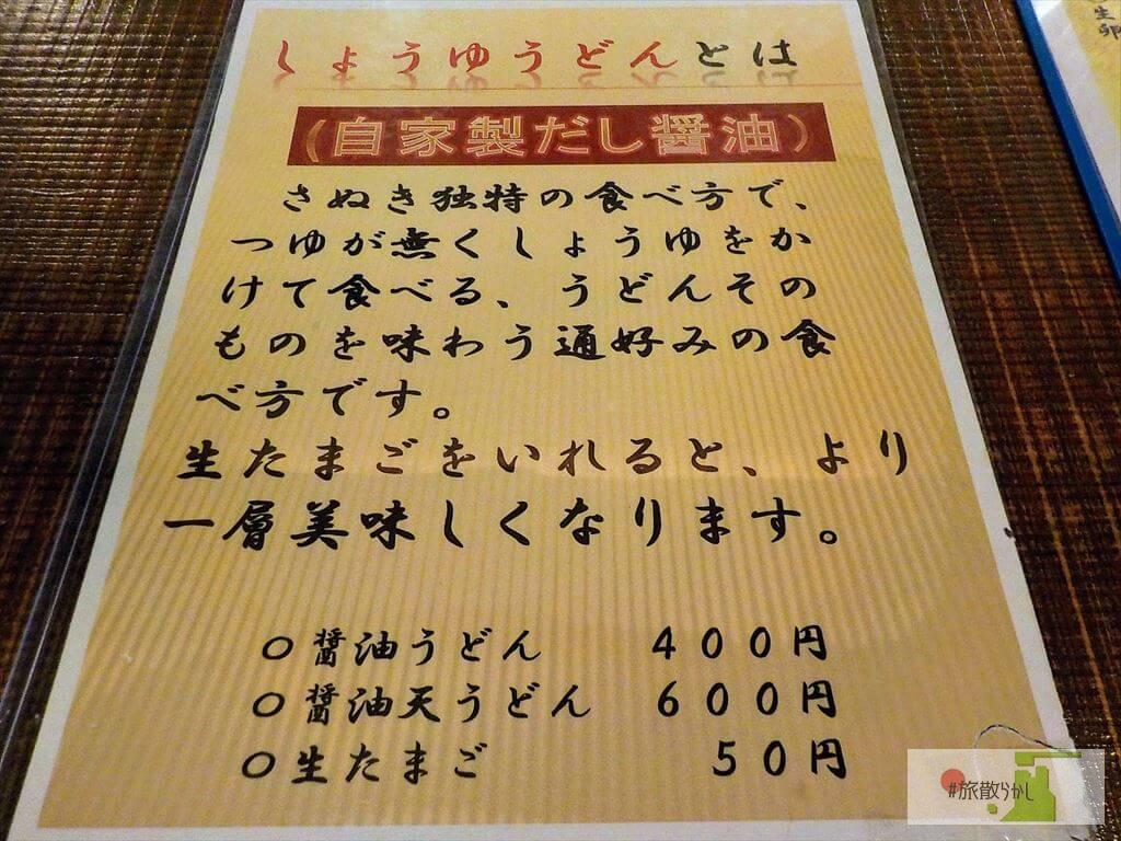 「こんぴらうどん」と書かれたのれんをくぐり、店内に入ります。まだ開店直後だったようで、店内にお客さんはいません(直後続々入ってきた)。メニューを見ると、しょうゆうどんが推しらしい。