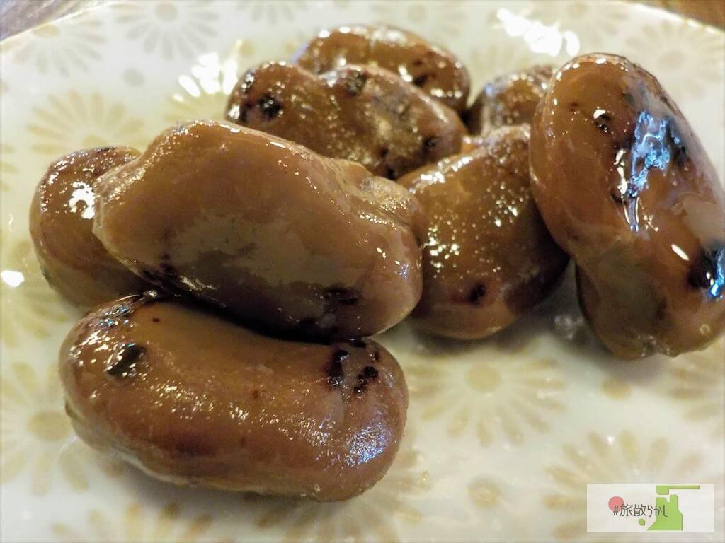 さらに、1皿(たしか)100円の「しょうゆ豆」も追加してみました。しょうゆ豆は、煎ったそら豆を甘いしょうゆタレに漬けて作った香川の家庭料理です。東京でも食べる煮豆は柔らかいものが多いですが、しょうゆ豆は煎っている為、身がある程度固まっており、口の中で砕ける食感が特徴的です。ごちそうさまでした。