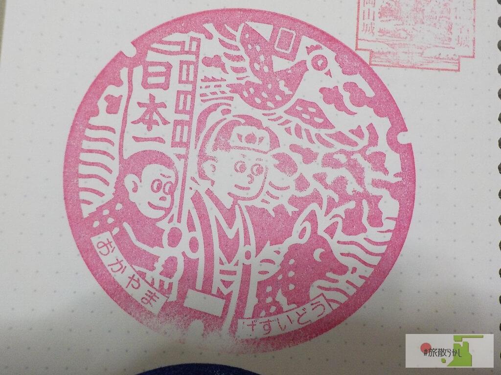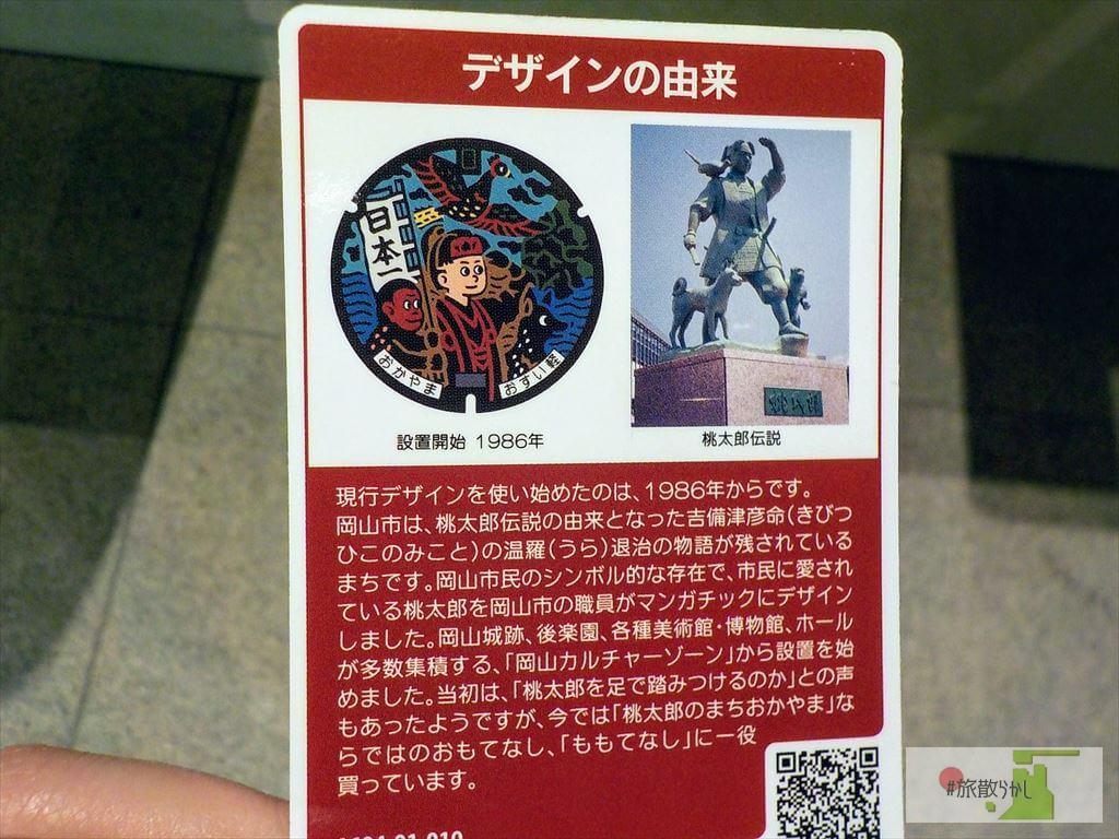 岡山駅にももたろう観光センターがありまして、岡山市マンホールカードを貰ってきました。ももたろうのキャラクターが描かれているポップなデザインです。