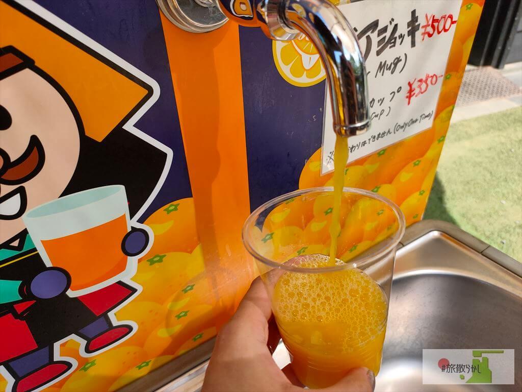 「愛媛では蛇口からオレンジジュースが出るらしい」という愛ある地方いじりネタを聞くこともありますが、そんな都市伝説を現実に具現化したのがこちらの蛇口からオレンジジュースマシンなのでした((蛇口からオレンジジュースマシンは、他にも松山空港や物産館にもあります。ただしこの時期、稼働中止している場合も多いので要注意。))。