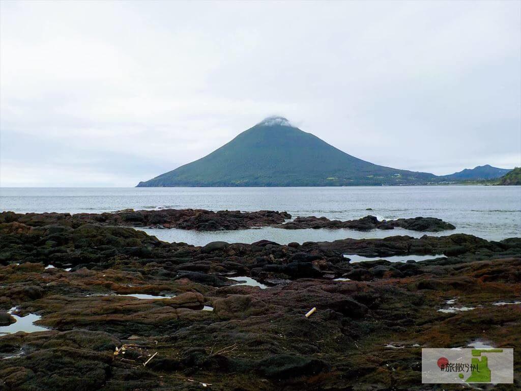 長崎鼻は薩摩半島の南岬で最南端にあたります。弓状の砂浜の先には開聞岳が望め、屋久島・硫黄島は天気が良ければ見られます。一帯は霧島錦江湾国立公園の一角を成しています。