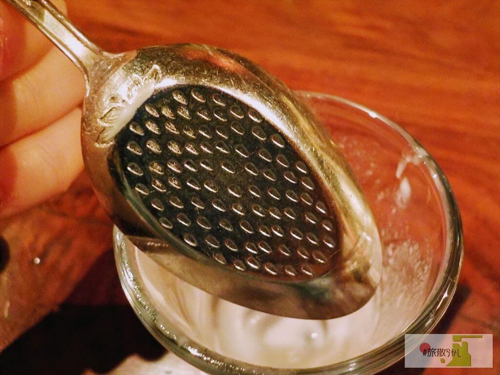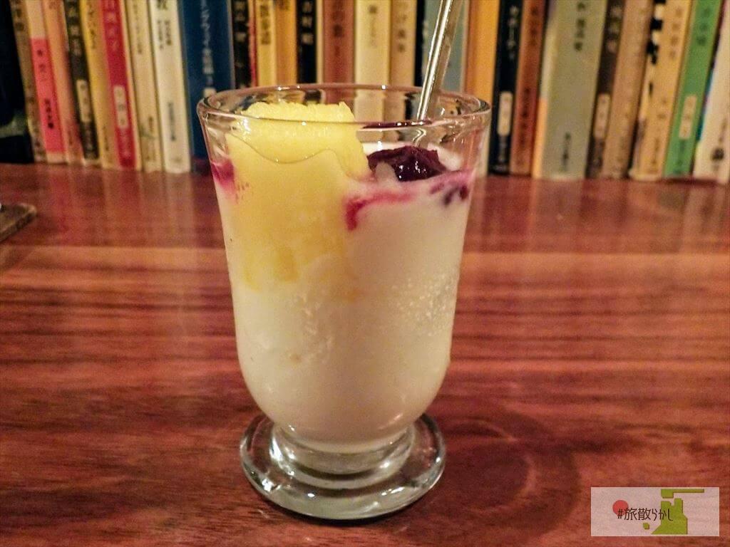 また、お通し(チャージ代)としてヨーグルトが出てきました。手が込んでますよね。バーだと適当なナッツが数粒出て来て誤魔化されるだけのチャージで、ちゃんとしたデザート。評価が高いのにも納得です。