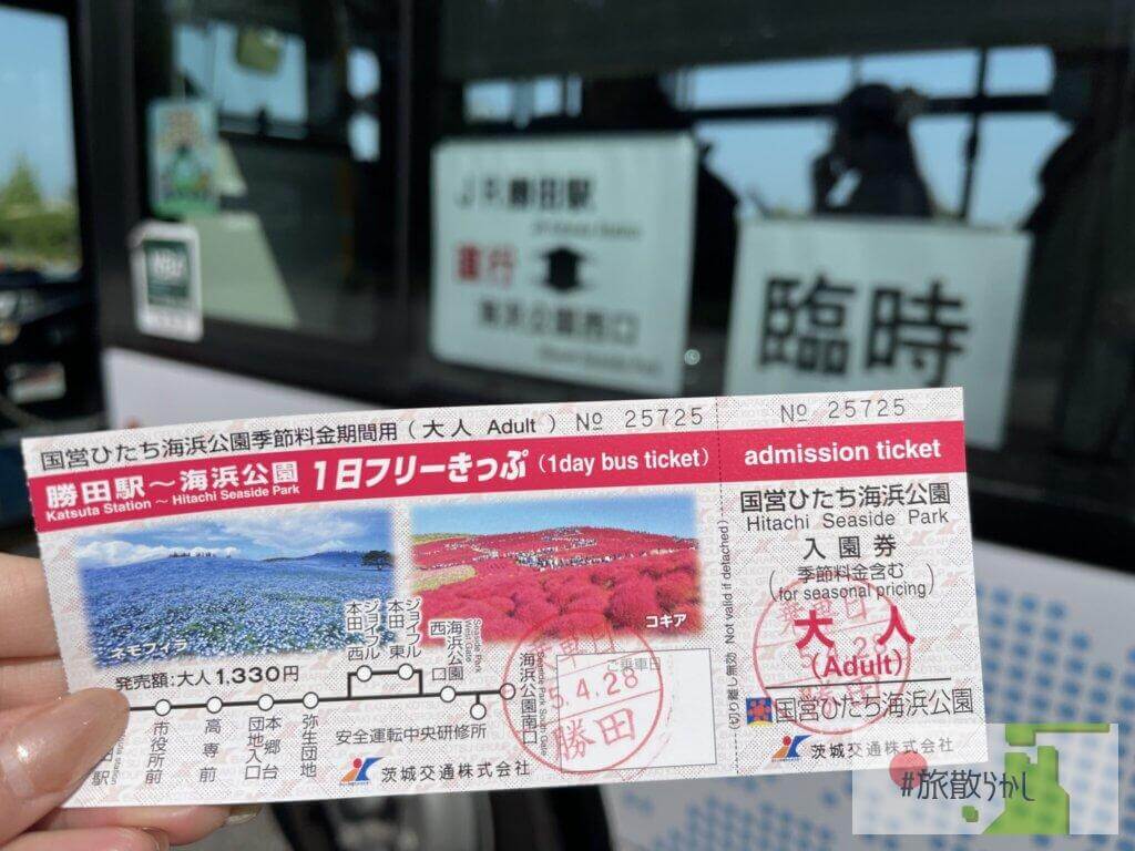 勝田駅から「海浜公園西口」までバスが出ています。ネモフィラの時期には臨時増便(直行便)もあるので安心です。バス乗り場では茨城交通社が販売している「1日フリーきっぷ」を購入するのがおすすめ。バスの往復料金+海浜公園の入園がこちら1枚で可能です。大人1枚1,330円(2023年4月時点)。バス乗り場付近に机を置いてスタッフの方が販売していますので、乗り場まで行けば分かると思います。