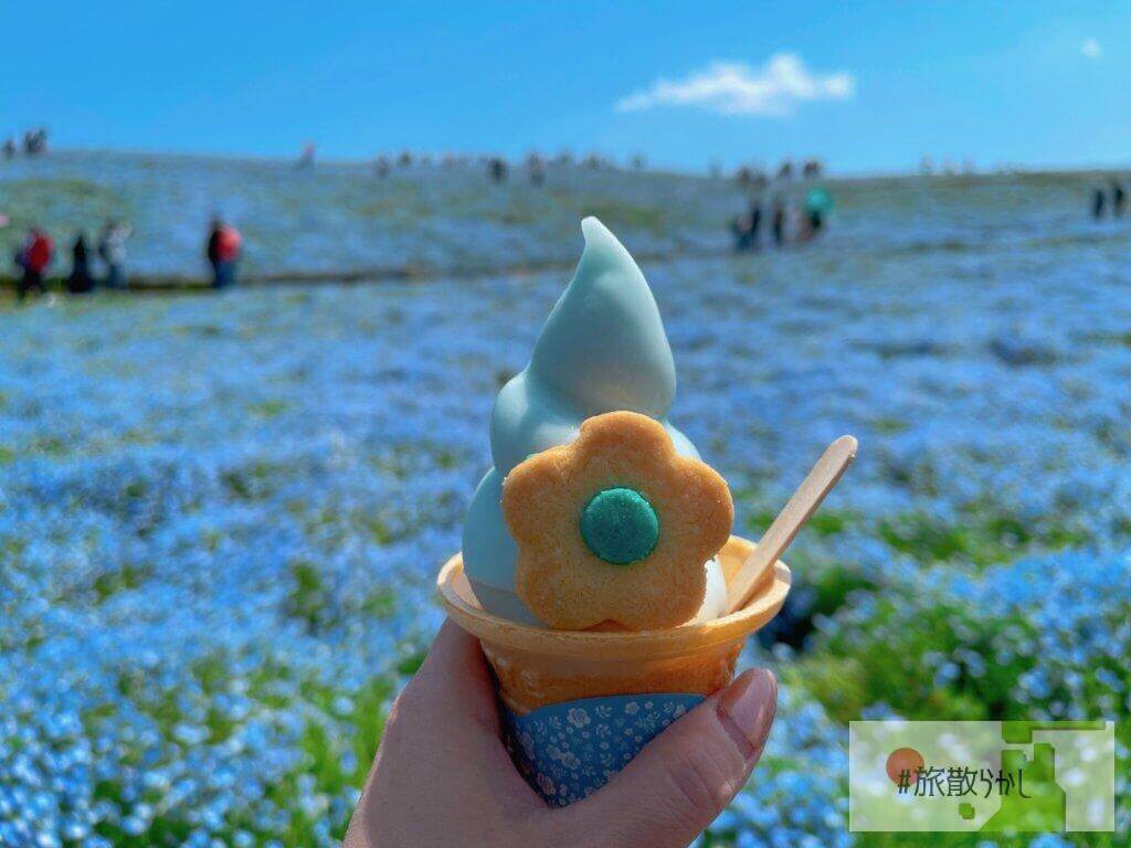 ひたち海浜公園では、ネモフィラの咲いているみはらしの丘の近くで、軽食も販売しています。特に人気なのが「ネモフィラブルーソフト」。ネモフィラの青色を取り入れたソフトクリーム(ソーダ味)で、行列が出来るくらい並んでいることもあります。ネモフィラの時期は、天気が良ければ汗ばむような温かい気候なので、ソフトクリームは小腹を満たすのにぴったりです。