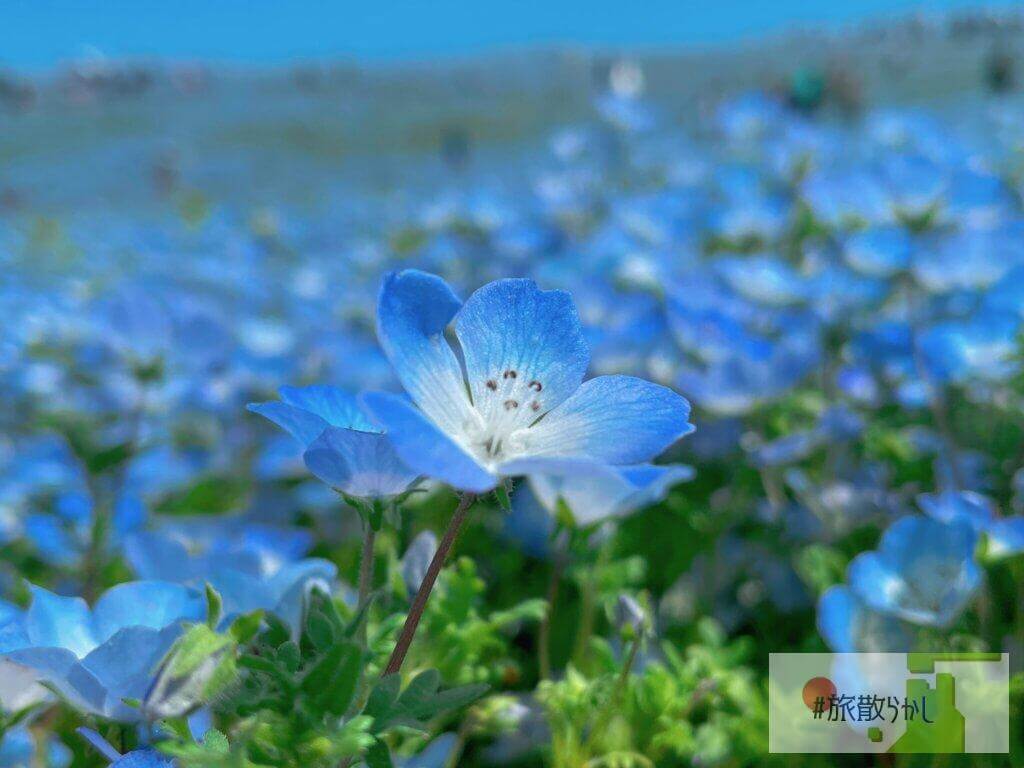 ネモフィラ畑はどこの景色を切り取っても美しく、見ごたえ満点です。ひたち海浜公園では、毎年2種類のネモフィラの種を蒔いており、良く見ると違いが分かります。天気がよい日には、青い空と一面の青いネモフィラの絨毯で、全面が青いパノラマとなり、壮大で幻想的な絶景が堪能できます。
