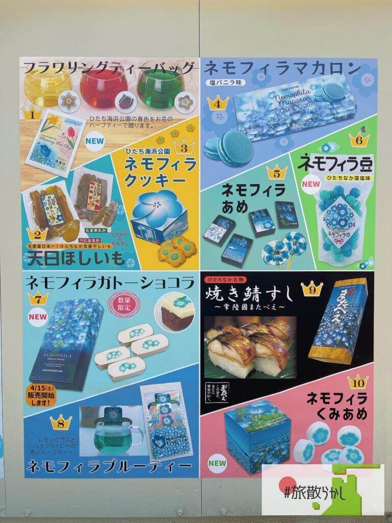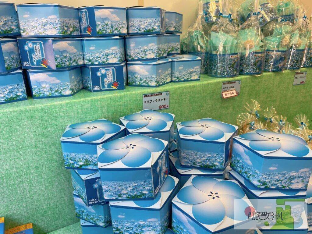 ひたち海浜公園のお土産には、ネモフィラをあしらった商品がたくさん展開されています。クッキーやマカロン、ハーブティーなどが人気です。みはらしの丘だけではなく、お土産屋さんの店舗内もネモフィラ関連商品で青に染まっていました。