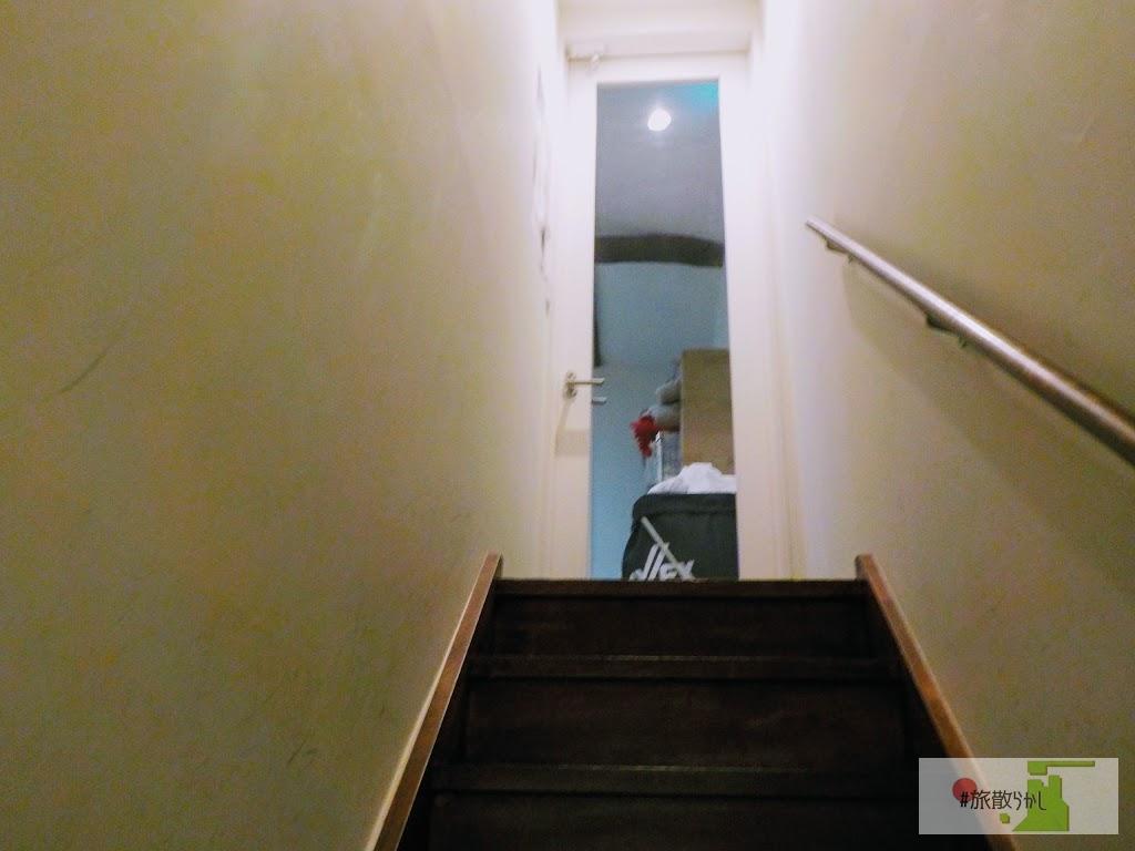 1階は喫茶店、2階は民宿です。ドリンクを頂いたら、宿泊場所の2階へ向かいましょう。こんな感じのおしゃれな、そしてちょっとわくわくする階段を登っていきます。
