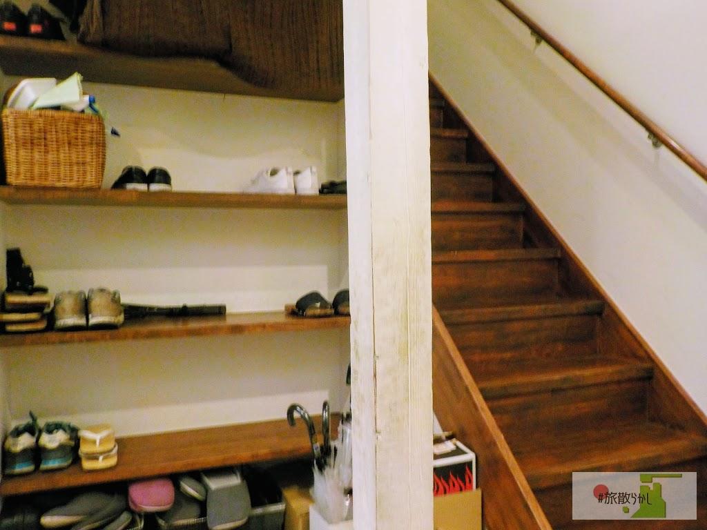 (左)「西アサヒ」2階の民宿へお邪魔する。(右)靴はここで脱ぐ。写真左は下駄箱。空いているところに適当に押し込む。