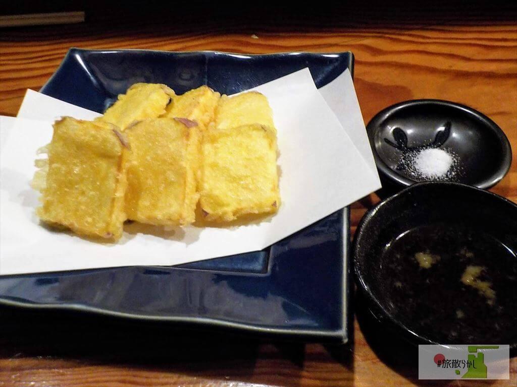 うず潮でお馴染み鳴門海峡付近で収穫される「なると金時」。食べやすく小口サイズで揃えられた「鳴門金時天ぷら」は甘みがあり、お菓子を食べているような気分。かといって甘さを感じ過ぎることがなかったのは、ほくほくとした食感のおかげだろう。