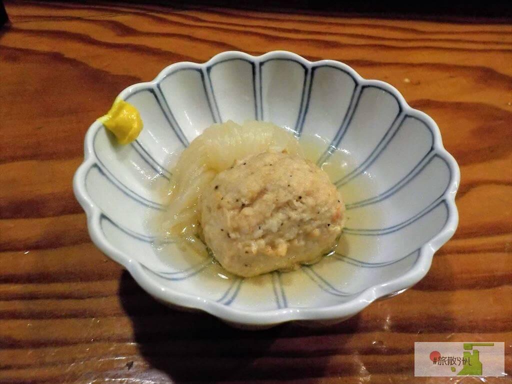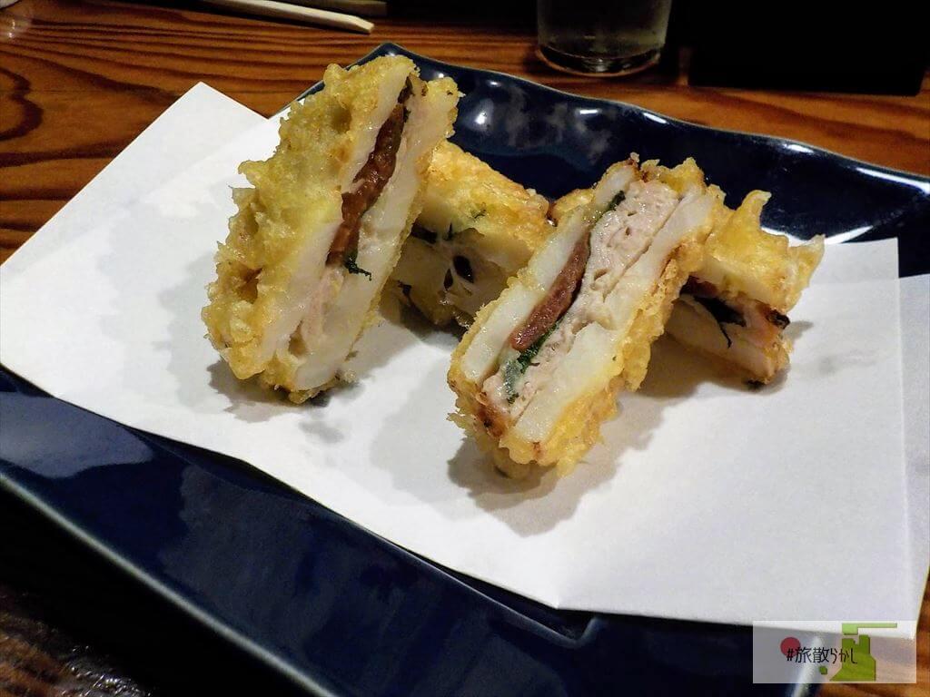 レンコンは徳島県が全国2位の収穫量で有名。「レンコン梅しそはさみ揚げ」はグルメサイトの口コミでも人気だったので注文。サクサクの衣と軽い食感のレンコンに肉の旨味と梅の酸味がたまらない。しその風味も相まって、酒が減る。