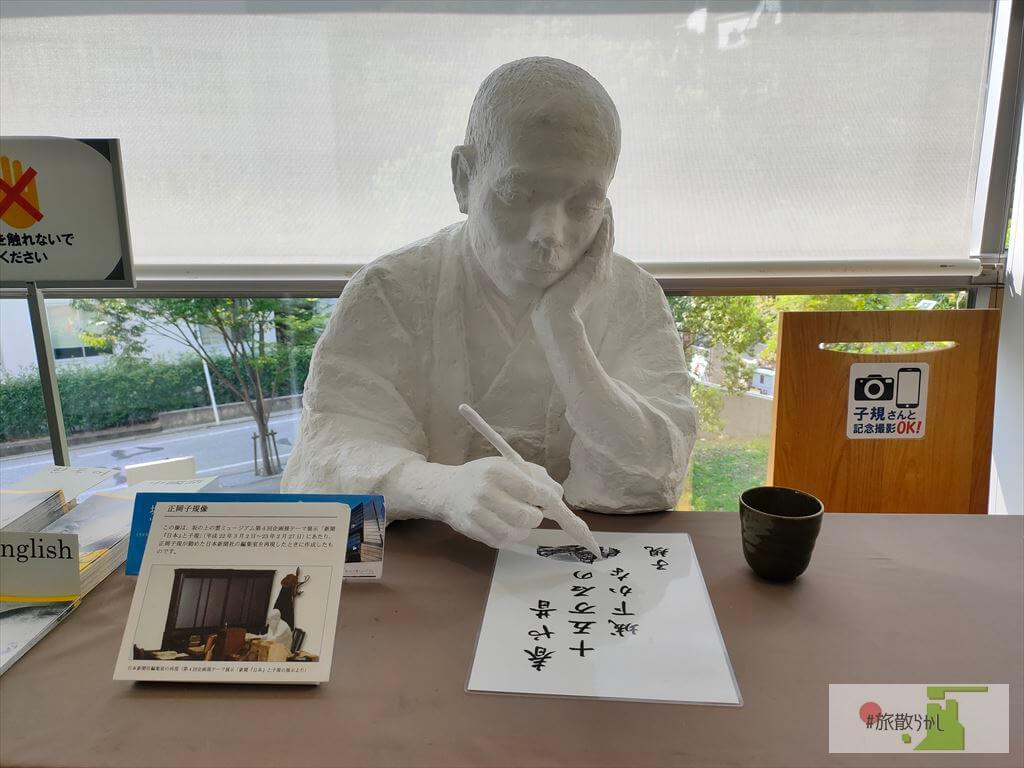 明治時代を代表する正岡子規は、愛媛松山出身の文学青年です。俳人として成功し、ホトトギス(雑誌)で活躍してきました。そんな正岡子規が座る隣の席が空いていますので、一緒に座って記念撮影しちゃいましょう。