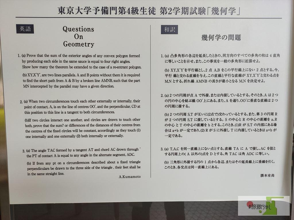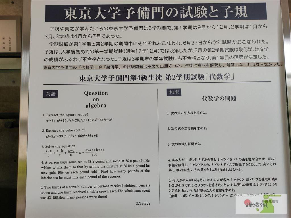 正岡子規が通っていた頃の東大予備門の学期末試験の問題が展示されていました。代数学と幾何学の問題です、腕に自信がある方はチャレンジ。展示には和訳がついていますが、当時は問題文も英語。英文を理解した上で数学の問題を解くという、なんともハードな試験だったそうです。