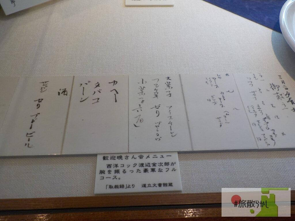 農学校に新しくブルックス先生という方が着任されたときに、晩餐会で振舞われたメニューです。地元の札幌パークホテルが協力して、メニューの再現をしています。