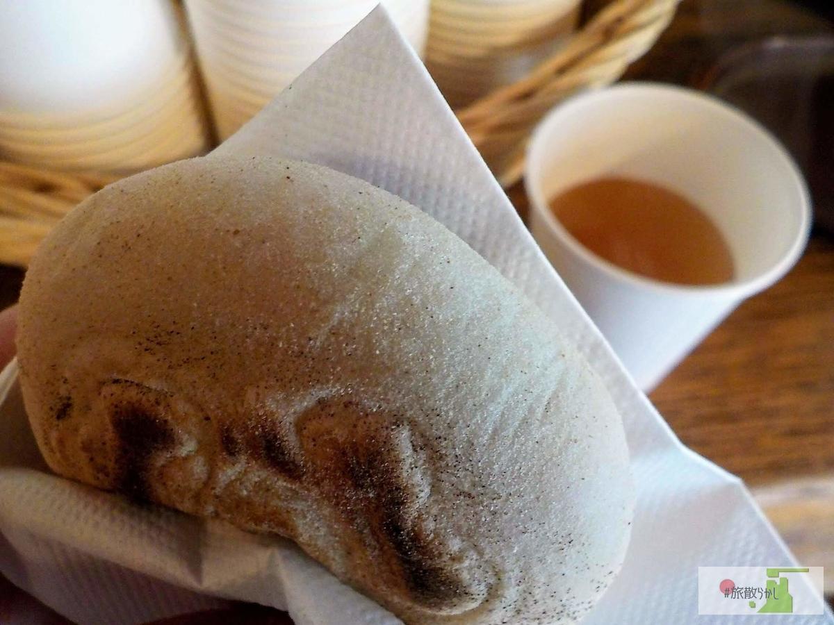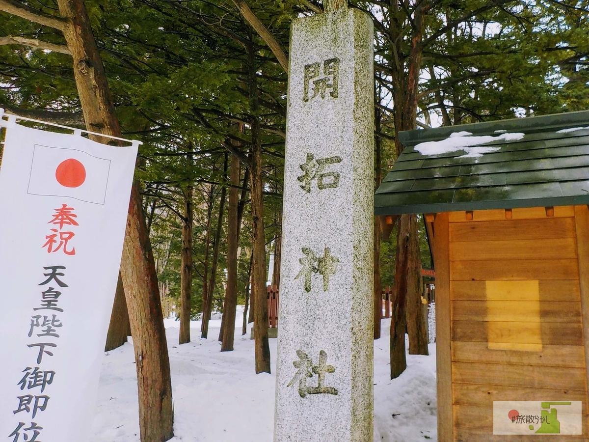 (左)開拓神社。北海道神宮の境内社で、蝦夷開拓に貢献した人々を祀る。(右)六花亭の判官さま(100円)とほうじ茶。店内で焼き立てを食べられる。六花亭は札幌にいくつか店舗がある。神宮茶屋店が北海道神宮の拝殿向かって右手前付近にあるので、参拝後の休憩に丁度良い。/六花亭神宮茶屋店/10:00~16:00/無休(ただし季節による)。