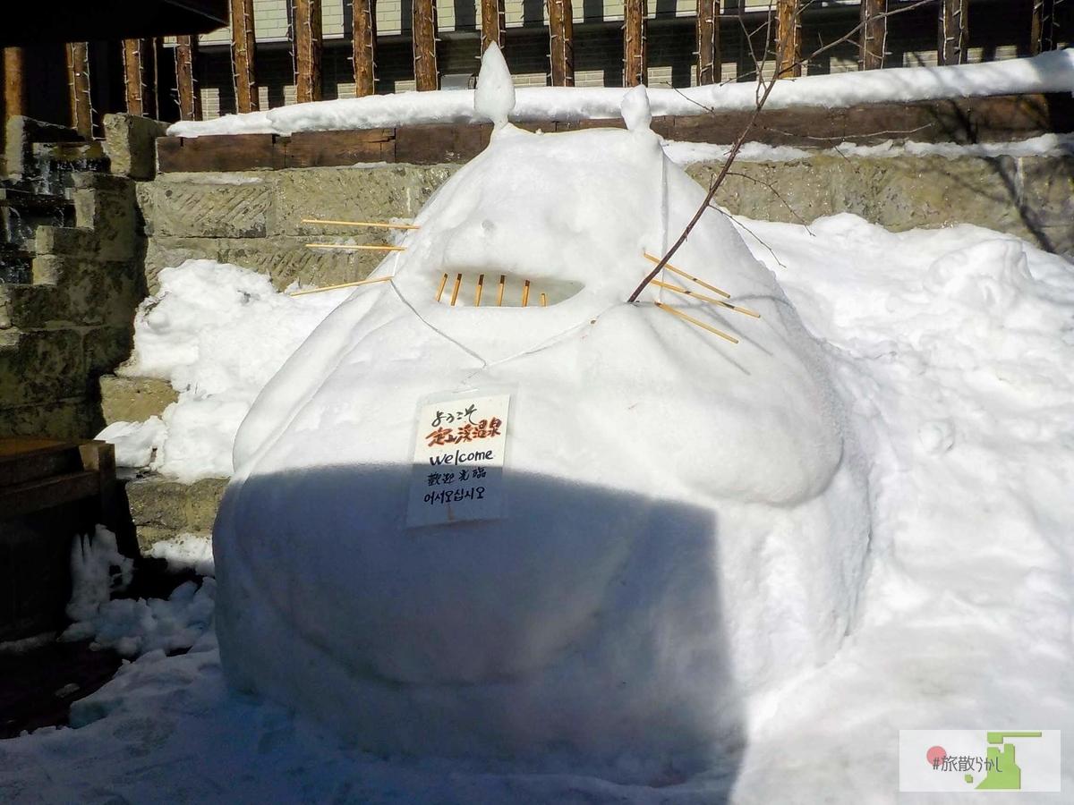 (左)定山渓万世閣ホテルミリオーネ1階「バーチテラス」にてモーニング。バーチコーヒー500円、クロックムッシュ200円、塩パン85円。(右)道端で出会った雪製トト〇。