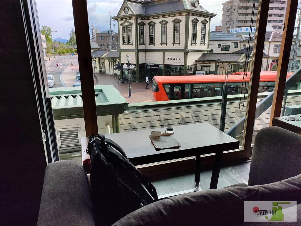 - 内観。窓際の席はガラス張りで道後温泉駅を眺めることができる。