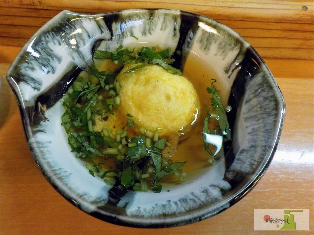 - お出汁の中で崩して、出汁を染み染みにし、大葉も抱き込んで口に運ぶ。旨。