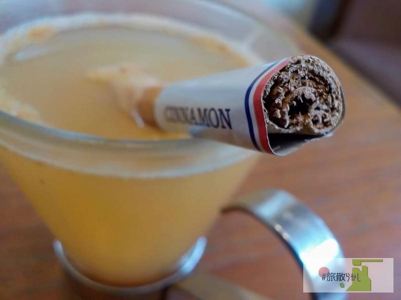 (左)ストロベリークリーム(510円/持ち帰りの場合)。和歌山県産「さちのか苺」を使用した苺クリーム。ほんのり酸味があり、素材の味をしっかり感じられる。(右)アップルシナモンティー(650円)。シナモンを挿して、かき混ぜて飲む。