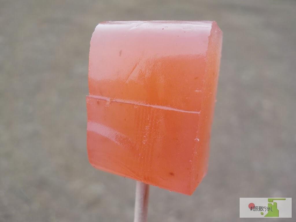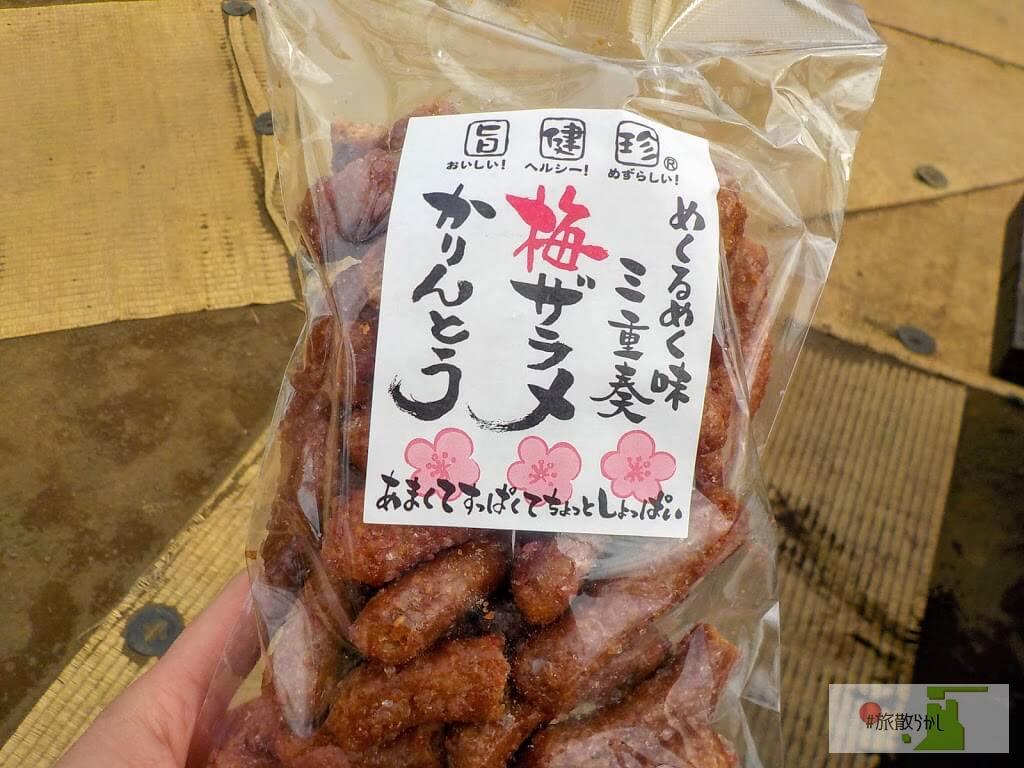 (左)梅大福(160円)。柔らかめでモチモチのお餅と甘酸っぱい梅は相性抜群。梅土産の中では一番人気。中の餡は白あん。(中)梅ようかん(600円/紅白あり)の試食。梅果肉が練り込まれていて、口に入れるとほんのり酸味がある。少し駄菓子っぽい風味もあった。(右)梅ザラメかりんとう(380円)。仄かに酸っぱいくらいで、梅の風味はそれほどでもなかった。ザラメの甘さの方が強い。