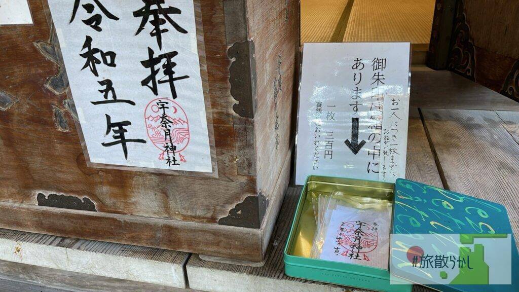 宇奈月神社の御朱印は、宇奈月神社拝殿内にある賽銭箱の横の缶の中にあるので、ご自身で取ります(書置きのみ)。初穂料300円は、御賽銭箱に入れればOKです。