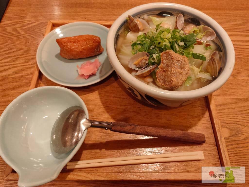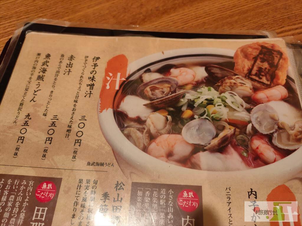 「瀬戸内新鮮魚の盛り合わせ」「今治焼鳥」「宇和島鯛めし」等々、愛媛郷土料理が並ぶ中で、急にうどんが食べたくなってしまい「魚武海賊うどん」を注文。瀬戸内の海鮮がしみ出しているお出汁が風呂上りの体に沁みます。