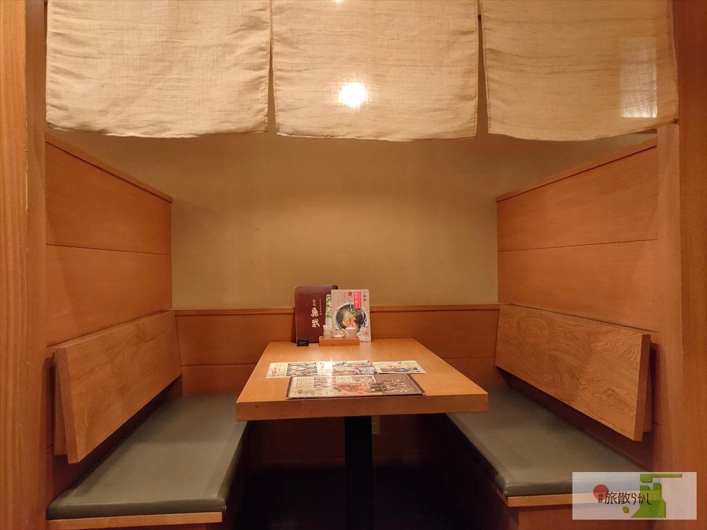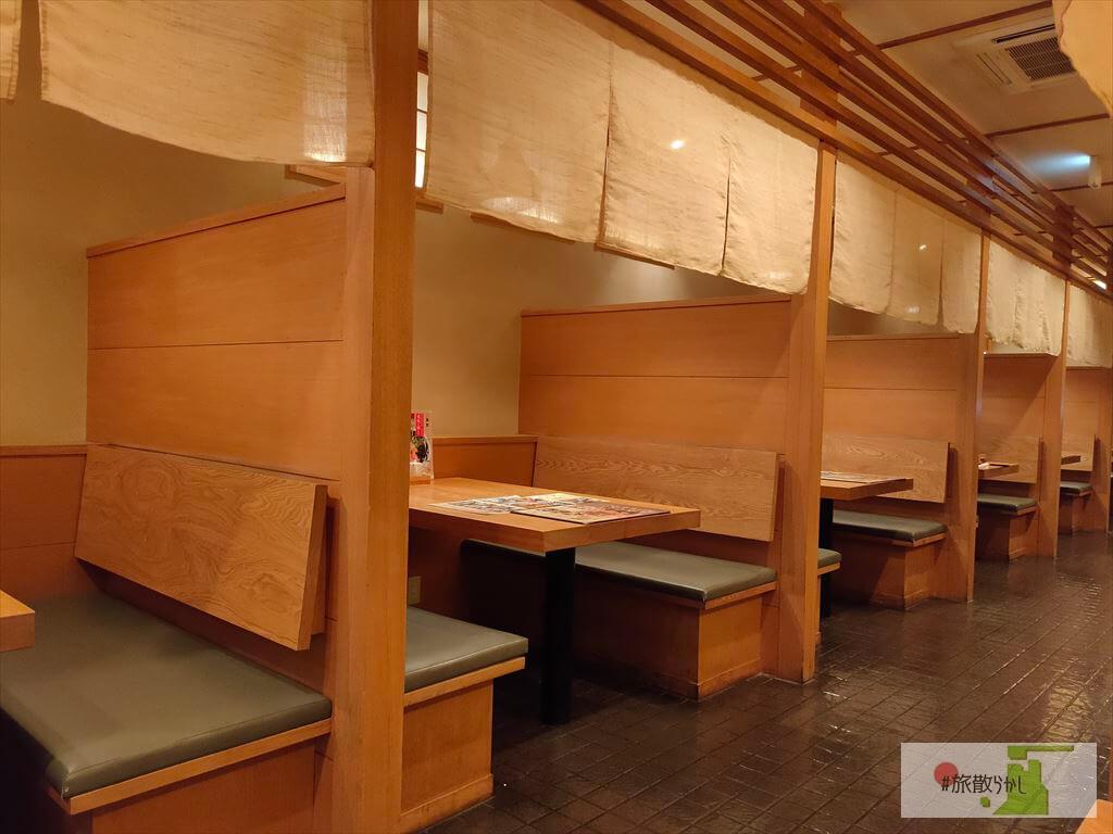 座席はこのように区切られているので、落ち着いて食べられるのがとても良いと感じました。一人旅の飲食店利用で気になるのは、一人でも穏やかに過ごせるのかという点。また、グループで来たとしてもボックス席で囲まれていて、楽しみやすいでしょう。