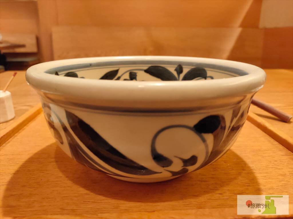 うどんを食べ進めながら、ふと手もとの器が「砥部焼」なのではないかと気付きました。もりっとしたフォルムで、白地に藍色の唐草模様。こういった気遣いも嬉しいですね。